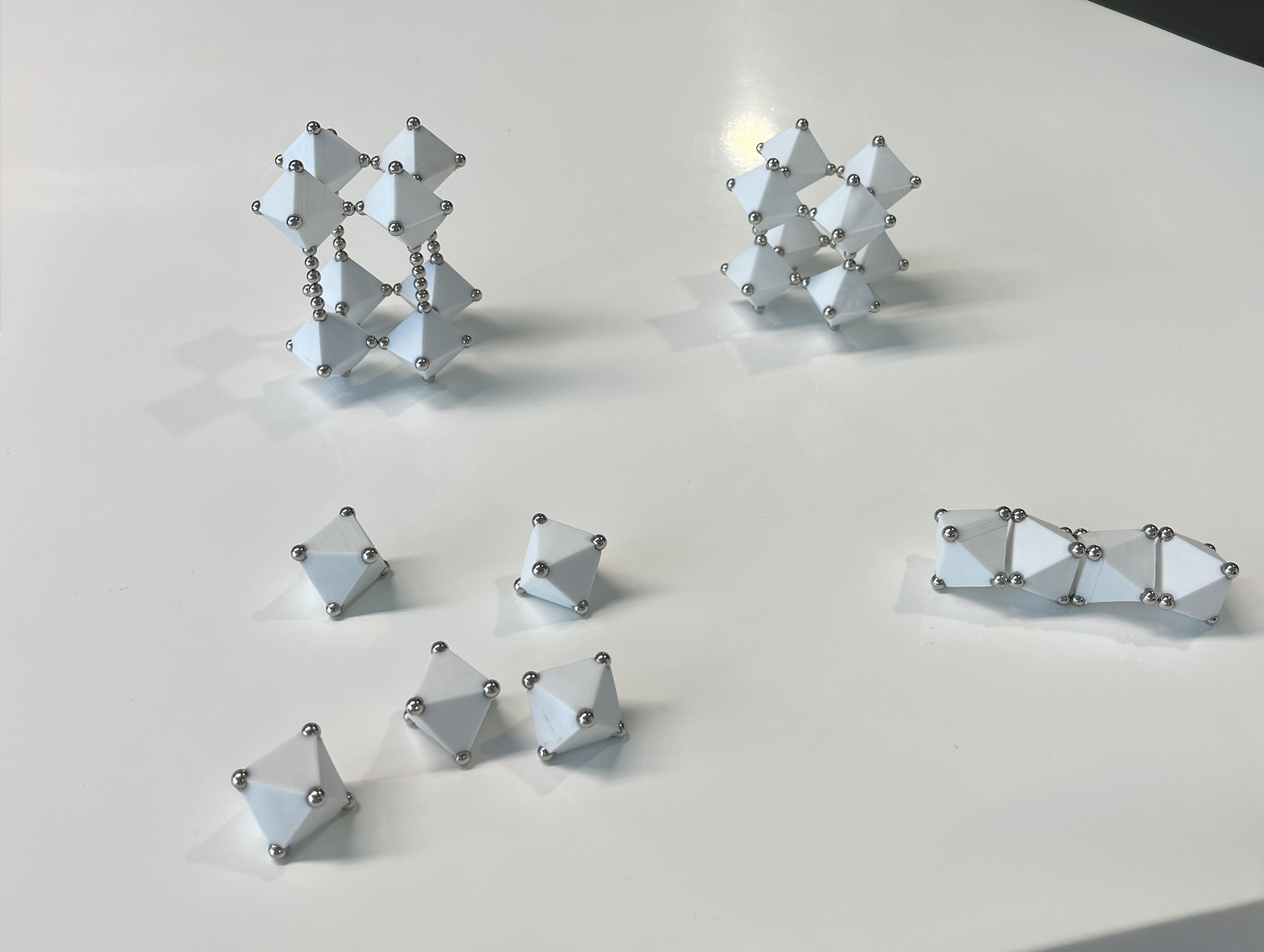 The final version was my attempt to upgrade the origami perovskite model. I wanted something modular, where the octahedra could be assembled and disassembled quickly and freely — a hands-on kit for exploring different connectivity in perovskites.