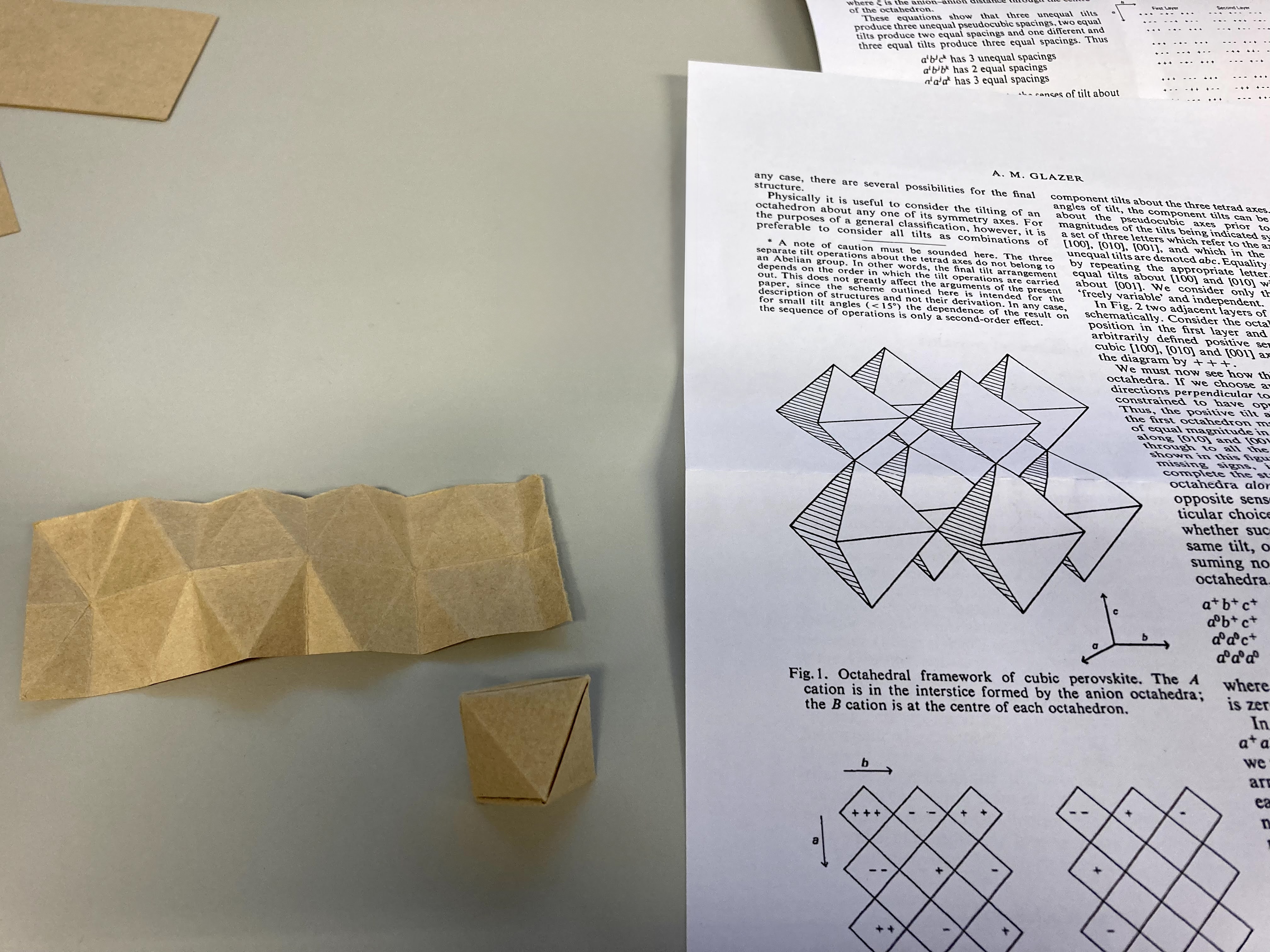 My first and simplest experiment was the origami perovskite. I made it in the very beginning of my perovskite journey while reading the classic paper “The Classification of Tilted Octahedra in Perovskites” by Mike Glazer — a must-read for anyone studying crystal structures.