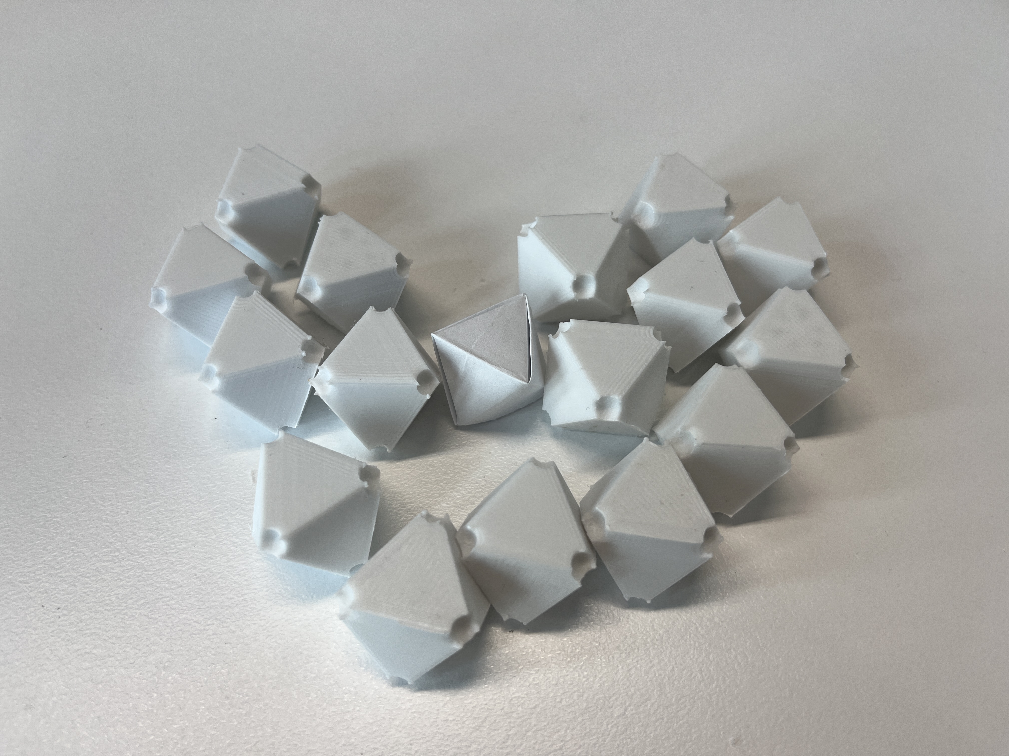 Each unit is 3D-printed as an octahedron with small cavities at each corner. (The .stl files are available here: [insert link].)